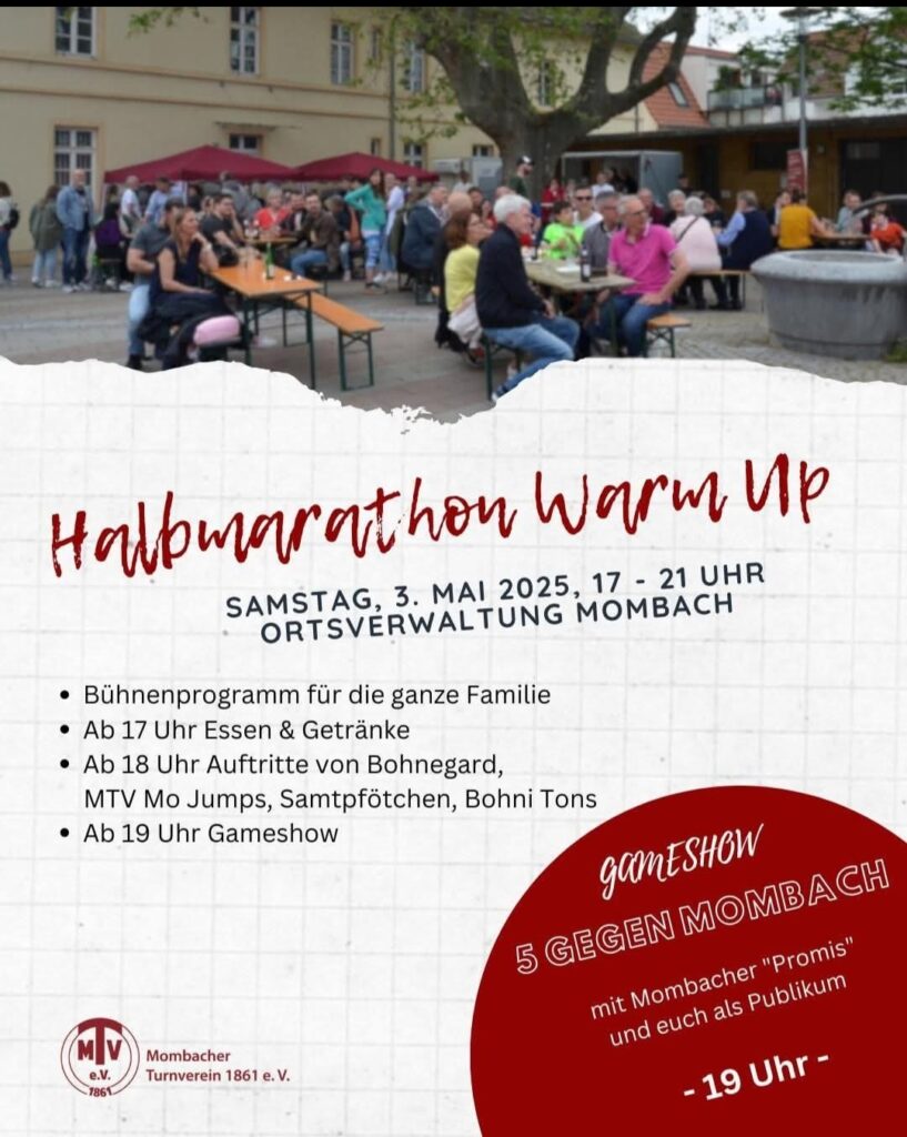 Sa. 03.05.2025: „Halbmarathon Warm up“ des MTV an der Mombacher Ortsverwaltung mit erfolgreicher Teilnahme unseres OBBER-MUCC Jörg Dietrich im „Promi-Team“ bei der beliebten Gameshow „5 gegen Mombach“:
